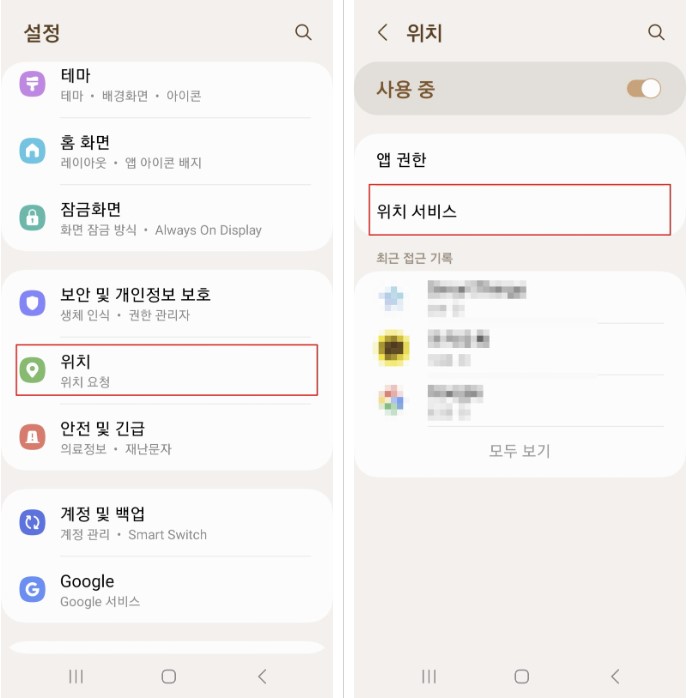 1. 설정 메뉴에서 위치 클릭