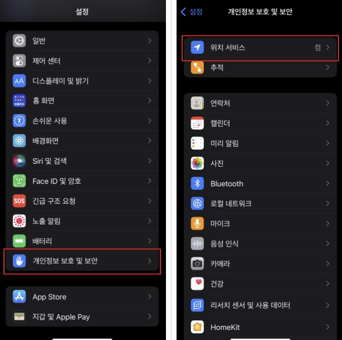 2. 개인정보 보호 및 보안 메뉴 설정에서 위치 서비스 클릭