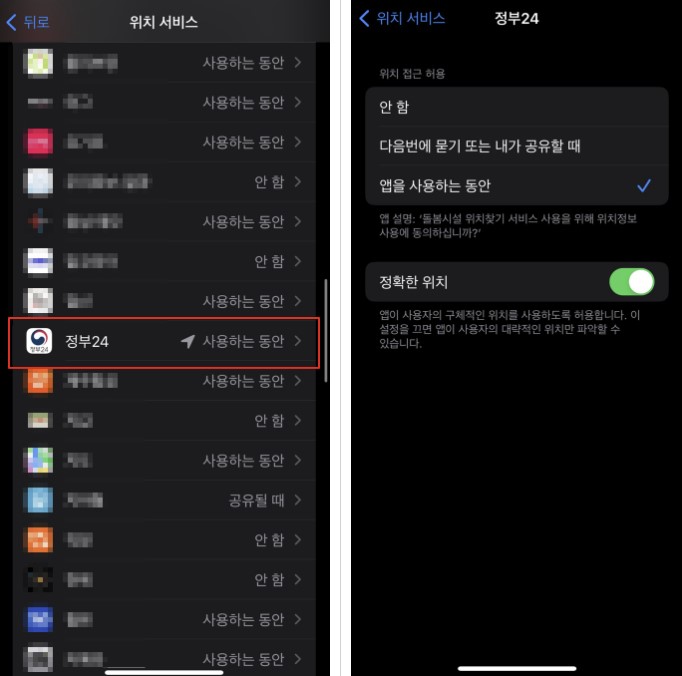 4. 위치 서비스 설정에서 위치 접근 허용 및 정확한 위치 사용 활성화