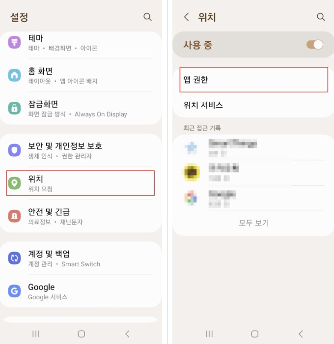 2. 위치 메뉴에서 앱 권한 클릭