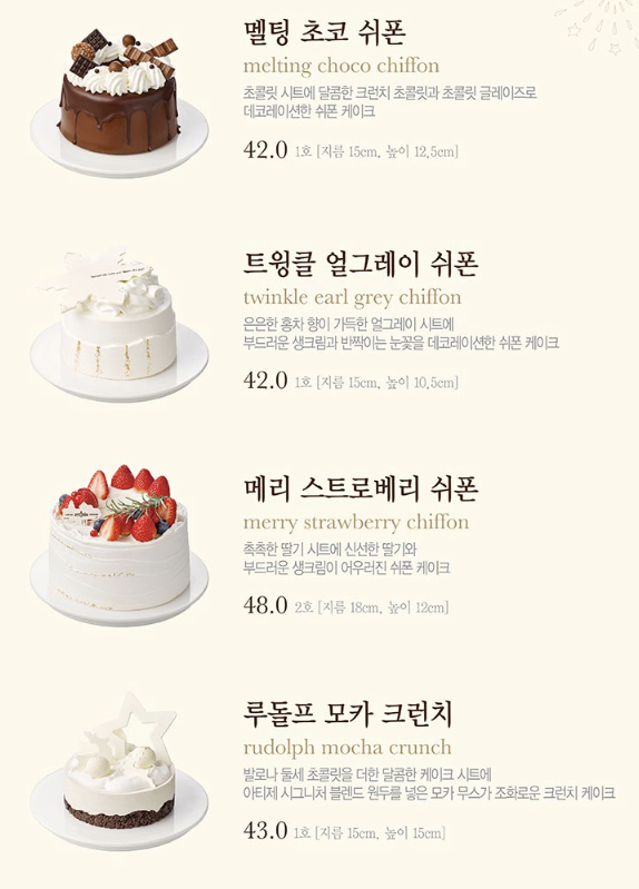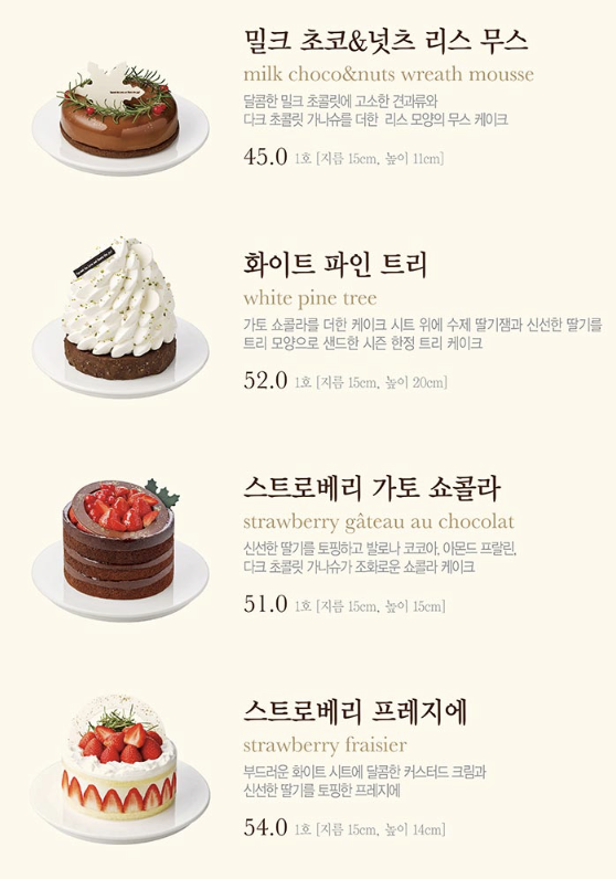 아래 사진은 사전예약 가능한 크리스마스 케이크 종류이며,