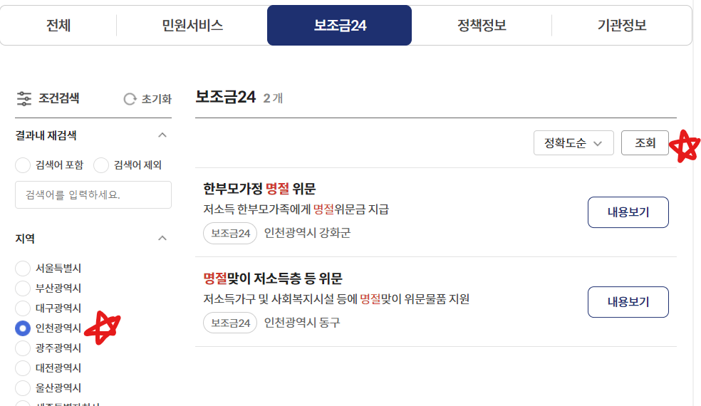 3. 왼쪽 탭의 인천광역시로 지역을 선택한 후 조회 클릭하기