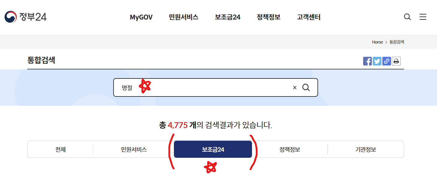 2. 보조금 24 페이지 검색창에 '명절' 이라고 검색합니다.