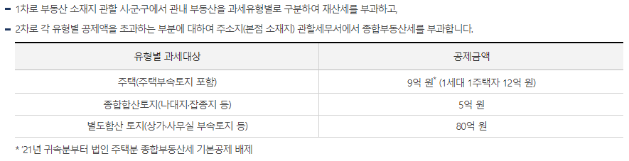 이번 포스팅에서는 종합부동산세 과세대상과 계산방법에 대해 말씀드리도록 하겠습니다.
