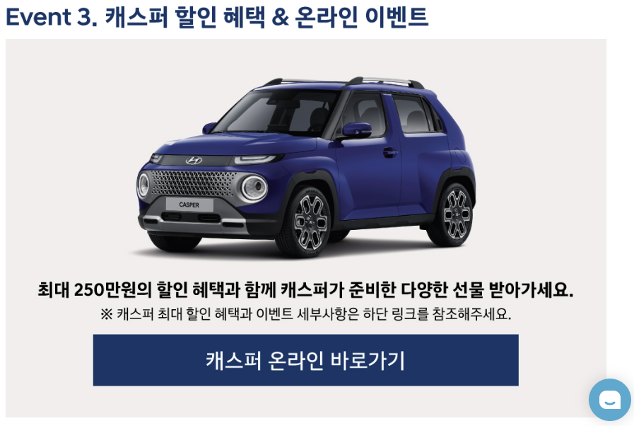 캐스퍼 최대 할인 혜택과 이벤트 세부사항은 캐스퍼 온라인 홈페이지에서 확인해주세요.