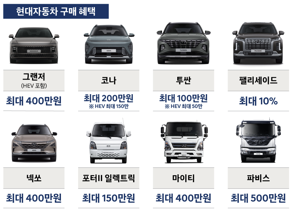전기차 3개 차종을 포함하여 승용차, RV 등 주요 차종별 할인율이 다르므로,