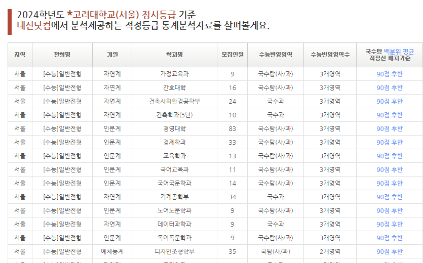 위 사진은 고려대학교(서울) 학과별 정시등급기준 일부를 캡쳐한 화면입니다.